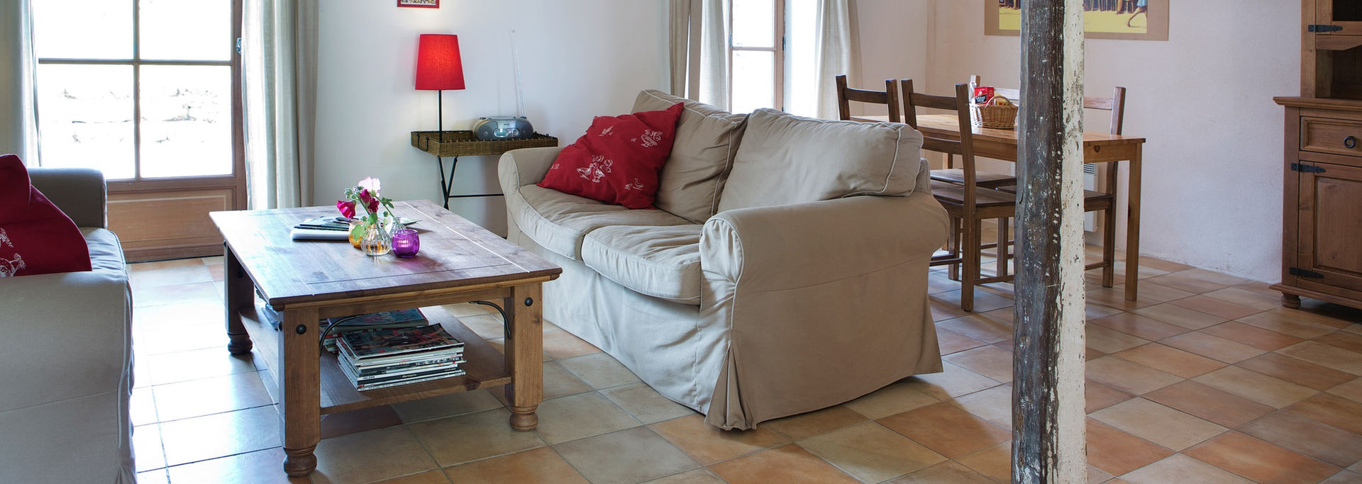 A welcoming gîte (75 m²) with 3 bedrooms and a bathroom. The entrance is just outside the courtyard entrance. There is a living/dining room with an open plan kitchen